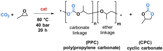 Due to the high thermodynamic stability of CO2 molecules, copolymerization reactions require highly reactive comonomers, which makes epoxides particularly suitable, thanks to the significant amount of energy released during their ring-opening process (114 kJ/mol, ca.) [6]. When CO2 reacts with epoxides, it results in polyalkylene carbonates with valuable properties such as thermoplasticity, high Young’s modulus, high transparency, UV stability, gas barrier properties, and biocompatibility [7,8,9]. Therefore, these CO2-based polycarbonates have been studied for several applications, especially for the preparation of polymer products (polyols for the synthesis of polyurethanes, polymeric coatings, polymer blends and composites), for battery applications (solid polymer electrolytes and gel polymer electrolytes for lithium-ion batteries), and for biomedical applications (scaffolds for tissue engineering, controlled drug delivery, tumor imaging), but also as sacrificial binders in the production of ceramics and adhesives, as barrier materials and foams for packaging of food or medical supplies, as thin films for flexible electronics, and as non-woven fabrics [9,10,11,12].
