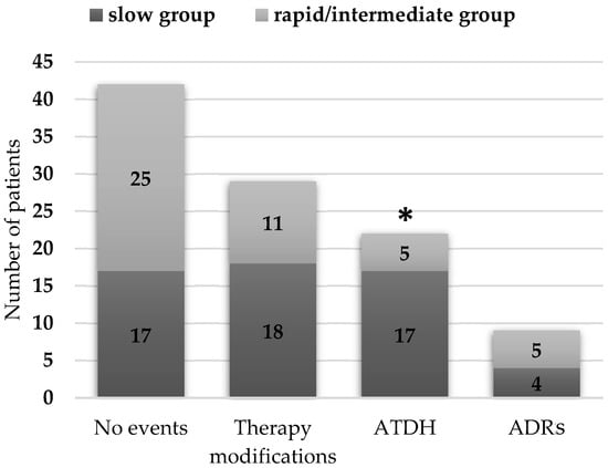 Out of the 102 individuals in the cohort, 22 (21.6%) developed ATDH as a first event, of which 17 (16.7%) were in the slow group and 5 (4.9%) were in the rapid/intermediate group. Other ADRs, primarily dermatological manifestations, were observed in nine patients (8.8%), including four slow acetylators and five rapid/intermediate acetylators. Notably, among these nine patients, five individuals (three slow acetylators and two rapid/intermediate acetylators) experienced at least two ADRs. Twenty-nine patients (28.4%) from the total cohort required treatment modifications to their initial standard therapy, primarily due to drug-sensitive TB, resulting in the discontinuation of EMB from the regimen (14.7%), the optimization of therapy with the addition of a fluoroquinolone (4.9%), or INH resistance (4.9%). Among the patients who underwent treatment modifications, 18 (17.6%) were in the slow group, while 11 (10.8%) were in the rapid/intermediate group. As illustrated in Figure 1, significant differences were observed in the distribution of the acetylation status with respect to the occurrence of treatment-related events. The most striking disparity was noted in regard to the incidence of ATDH, which was significantly higher in the slow acetylator group.