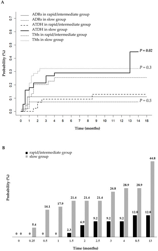 The risk of developing ATDH in the slow group compared to the rapid/intermediate group was assessed using the Fine and Gray competing risks regression model. In this model, ATDH was defined as the event of interest and was considered as such only when it occurred before any other events, while competing events included treatment modifications (TMs) and the occurrence of other adverse drug reactions (ADRs). By addressing the competing risk structure, the Fine and Gray model provides a more accurate comparison than standard survival analysis methods, such as the log-rank test, which might ignore competing events. The analysis was adjusted for the patient’s acetylation status, age, BMI, sex, alcohol consumption, concurrent viral infections, infection localization, and concomitant drugs. The results were reported as sub-distribution hazard ratios (SHRs), with their corresponding 95% confidence intervals (95% CI).
