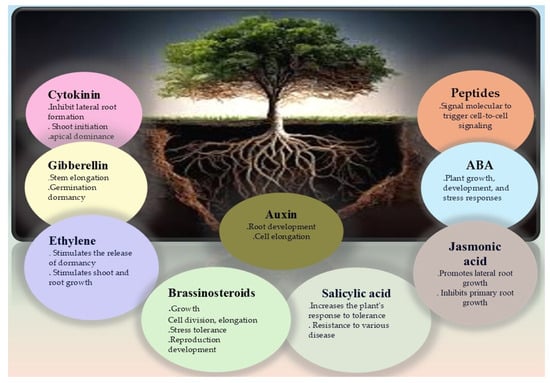 | Auxin | Facilitates root elongation and promotes lateral root development. | Facilitates root development and enhances water absorption. | Populus alba | [72] |