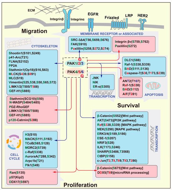 The Functions of PAKs. PAK target proteins that are involved in the process of cell proliferation, migration and survival are listed in the boxes. The targets labeled with green letters represent the phosphorylation by PAK1/PAK4, red letters represent that by PAK2/PAK5, and blue letters represent that by PAK3/PAK6. The numbers of “S/T” in the brackets represent the phosphorylation sites.