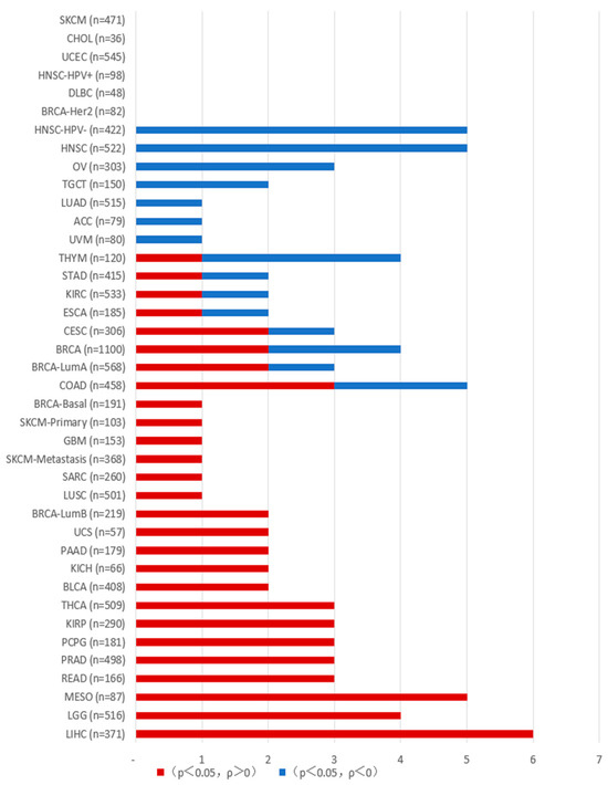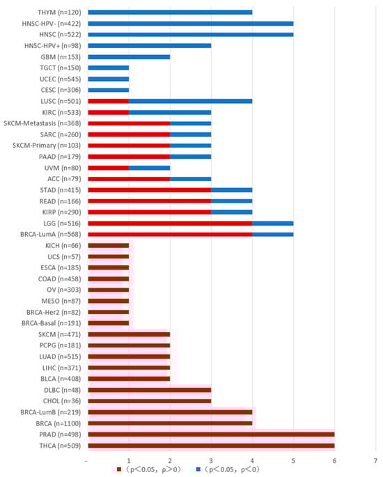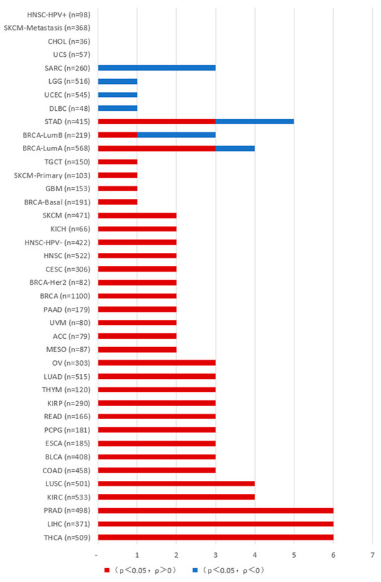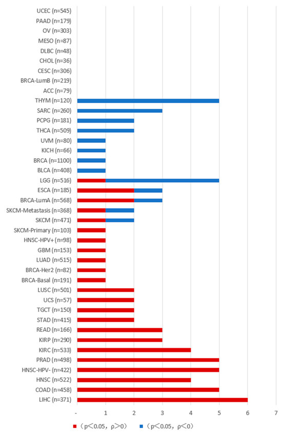 The correlation between PAK and macrophage infiltration in various tumors. The data were obtained from the Timer platform. When p > 0.05, there is no correlation between the gene expression of the PAK family and the degree of macrophage infiltration in cancer; values marked in red (p < 0.05, ρ > 0) indicate a positive correlation between PAK and macrophage infiltration in cancer; values marked in blue (p < 0.05, ρ < 0) indicate a negative correlation between PAK and macrophage infiltration in cancer.