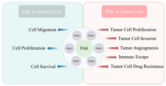 The roles of PAKs in both the normal physiological environment and the tumor environment.