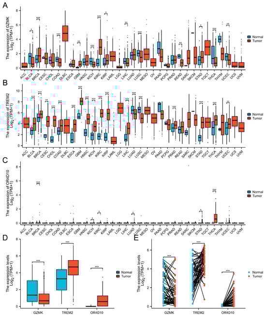 2.1. Pan-Cancer GZMK, TREM2, and OR4D10 Expression Analysis