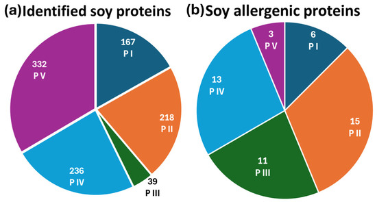 Pie charts of (a) the total number of identified soy proteins and (b) the identified soy allergenic proteins across all five extraction protocols.