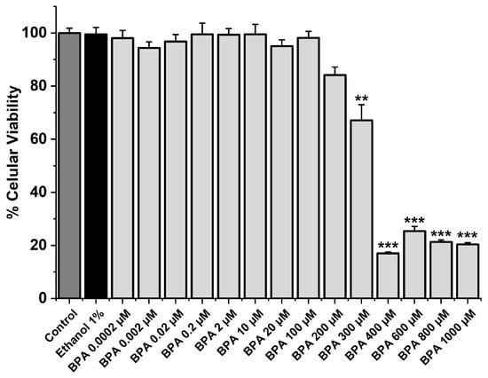 The MTT assay was performed to analyze the cellular viability of SMC-MCAs exposed to BPA at different concentrations (0.0002, 0.002, 0.02, 0.2, 2, 10, 20, 100, 200, 300, 400, 600, 800, and 1000 μM). In addition to BPA, the cells were exposed to ethanol for 24 h, i.e., the solvent used to dissolve the BPA (vehicle), and to the culture medium as a control. Only the five highest BPA concentrations (300, 400, 600, 800, and 1000 μM) significantly reduced cell viability (p < 0.05), as Figure 1 illustrates. Comparing the other concentrations with the vehicle and the control, no changes were found. The original data can be seen in Table S1.