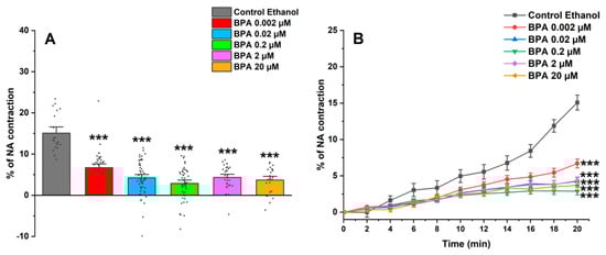 (A) Effect of the action of 1 μM of NA on SMC-MCAs. Percentage of NA-induced contraction after 24 h of incubation with exposure to various concentrations of BPA (0.002–20 μM). A total of 6 experiments (from 6 rats, to minimize genetic variability) were conducted, and all concentrations were tested in triplicate for each primary cell culture. Data are expressed as percentage (%) of contraction of noradrenaline over the basal area. The bars represent the mean ± standard error of the mean (SEM), and the small black dots represent the values. Statistical analysis was carried out using a Kruskal–Wallis one-way analysis of variance on ranks (p < 0.05), followed by Dunn’s method, where *** p < 0.001. (B) Temporal profile of the contraction induced by the action of NA (1 μM) in the first 20 experimental minutes, every 2 min, in SMC-MCAs exposed for 24 h with various BPA concentrations (0.002–20 μM). Statistical analysis was carried out using the two-way ANOVA method, followed by multiple comparisons vs. the control group (Holm–Sidak method), where *** p < 0.001. Abbreviations: middle cerebral artery smooth muscle cells (SMC-MCAs); bisphenol A (BPA); noradrenaline (NA).