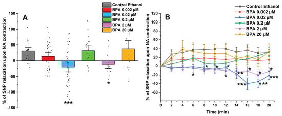 (A) Effect of the SNP relaxation (1 μM) on SMC-MCAs after contraction with 1 μM of NA. Percentage of relaxation induced by SNP after 24 h of incubation with exposure to various concentrations of BPA (0.002–20 μM). A total of 6 experiments (from 6 rats, to minimize genetic variability) were conducted and all concentrations were tested in triplicate for each primary cell culture. The data are expressed as a percentage (%) of relaxation over the basal area, upon contraction with noradrenaline. The bars represent the mean ± standard error of the mean (SEM), and the small black dots represent the values. Statistical analysis was carried out using a Kruskal–Wallis one-way analysis of variance on ranks (p < 0.05), followed by Dunn’s method, where * p < 0.05 and *** p < 0.001. (B) Temporal profile of SNP (1 μM) relaxation, after contraction with NA (1 μM), every 2 min, in SMC-MCAs incubated for 24 h with various concentrations of BPA (0.002–20 μM). Statistical analysis was carried out using the two-way ANOVA method, followed by multiple comparisons vs. the control group (Holm–Sidak method), where * p < 0.05, ** p < 0.01 and *** p < 0.001. Abbreviations: middle cerebral artery smooth muscle cells (SMC-MCAs); bisphenol A (BPA); noradrenaline (NA); sodium nitroprusside (SNP).