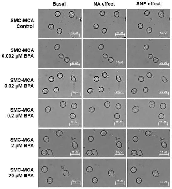 Sample photos from a typical SMC-MCA contractility experiment captured through the planar cell surface area (PCSA) technique. The basal column represents the cells without vasoactive agent addiction, the effects of noradrenaline are shown in the NA column (where a decrease in cell area can be seen, which corresponds to a vasoconstrictor effect), and the effects of sodium nitroprusside are shown in the SNP column (where an increase in cell area can be seen, which corresponds to a vasorelaxant effect), after a 24 h pre-incubation period with various concentrations of BPA (0.002–20 μM). Abbreviations: middle cerebral artery smooth muscle cells (SMC-MCAs); bisphenol A (BPA).
