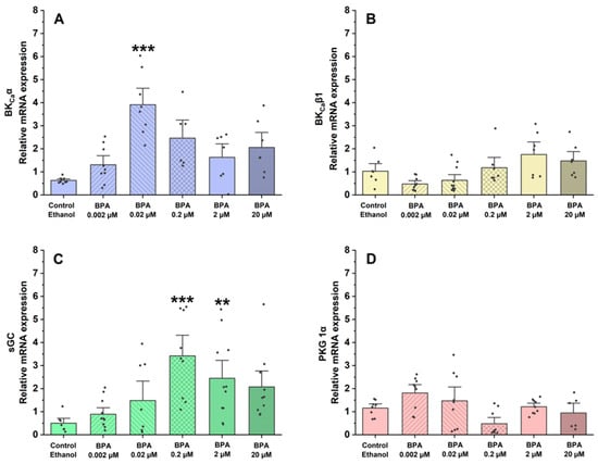 The qPCR was employed to evaluate the mRNA expression of a few proteins and ion channel subunits implicated in the vascular vasoactive response, according to our earlier works [,]. For this purpose, to investigate the response to BPA treatment, the mRNA levels of distinct genes (large-conductance Ca2+-dependent K+ channels (BKCa) subunits -α 1.1 and β1, soluble guanylate cyclase (sGC) and protein kinase cGMP-dependent 1 α-subunit (PKG 1α)) were accessed (Table 2).