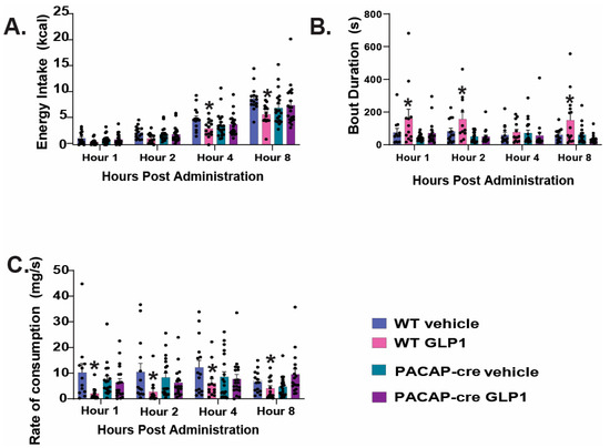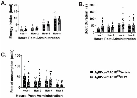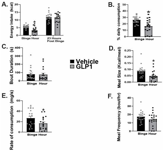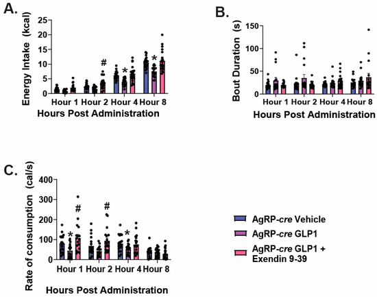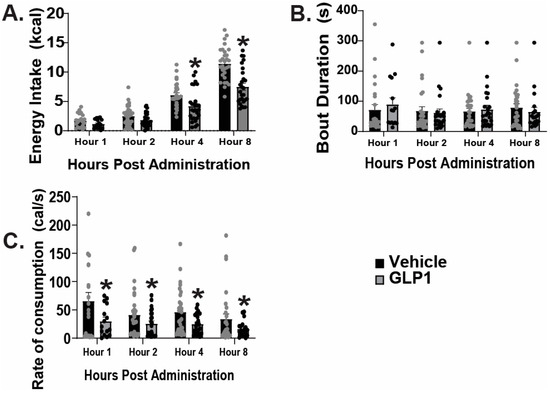 Behavioral studies measuring energy intake, bout duration, rate of consumption, and in some instances for binge experiments % daily consumption, meal size, and meal frequency were conducted utilizing a Comprehensive Lab Animal Monitoring System (CLAMS; Columbus Instruments, Columbus, OH, USA) as previously described and validated [16,32,33]. Briefly, energy intake was calculated by multiplying food intake (in g) times the number of calories per unit weight (3.1 kcal/g for standard chow; 4.3 kcal/g for the HFD). Bout duration was determined as the amount of time the animal’s head was over the food trough and actively engaged in energy intake, with a 10-s lower cutoff. The rate of consumption was measured as the energy intake divided by the bout duration in a given hour. The percent daily consumption was ascertained by dividing the energy intake during the binge hour by the total daily energy intake. Meal size refers to the energy intake per bout or meal, whereas meal frequency is the number of meals or bouts per hour. For the homeostatic feeding experiments, standard chow was used throughout. For the binge feeding experiments were given daily, one-hour access to the HFD (from 16:00–17:00 every day over the course of the experiment), and provided ad libitum access to standard chow during the remaining 23 h of the day. For all feeding experiments, animals were injected with either GLP1 (30 pmol; alone or in conjunction with Exendin 9–39 (30 nmol)) or a 0.9% saline vehicle control (0.2 μL) at 16:00 every day over the course of the experiment.