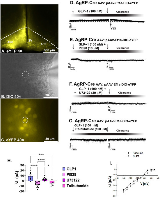 GLP−1 inhibits ARC NPY/AgRP neurons via activation of KATP channels. (A): Low power (4×) image showing YFP-labeled ARC AgRP neurons in a slice from an AgRP-cre mouse, (B) high power (40×) DIC image of a recorded AgRP neuron, (C) high power (40×) image of the same recorded AgRP neuron labeled with YFP. (D): Representative trace depicting the GLP1 induced outward current. This effect is abrogated in the presence of PI3-Kinase inhibitor PI828 (10 μM). (E), the PLC inhibitor U73122 (20 μM) (F), and the KATP channel blocker tolbutamide (100 μM) (G,H): Composite data that depicts the significant reduction in the GLP1-induced outward current by coadministration of GLP1 along with PI828, U73122 or tolbutamide. * p < 0.05, *** p < 0.001, **** p < 0.0001. (I): I/V plot illustrating the GLP1−induced increase in slope conductance and the reversal potential of approximately −90, corresponding to the Nernst equilibrium potential for potassium conductance.