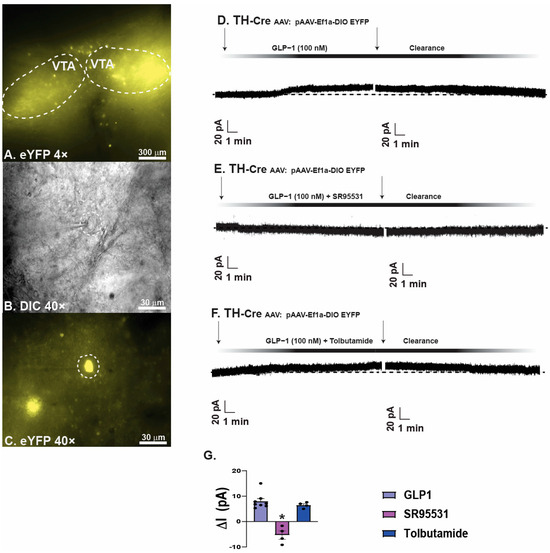 GLP1 inhibits A10 dopamine neurons via enhanced GABAA receptor-mediated input onto these cells. (A): Low power (4×) image showing YFP-labeled A10 dopamine neurons in a slice from a TH-cre mouse, (B) high power (40×) DIC image of a recorded A10 dopamine neuron depicted in circle, (C) high power (40×) image of the same recorded A10 dopamine neuron labeled with YFP depicted in circle. (D): representative trace showing the robust outward current induced by application of GLP1 (100 nM) in an A10 dopamine neurons, and this effect is reversed in the presence of GABAA receptor antagonist SR95531 (10 μM) (E), but not in the presence of KATP channel blocker tolbutamide (100 μM). (F,G), Composite data depicting that SR95531 promotes a significant change in current compared to GLP1 alone. Bars represent lines and means 1 SEM * p < 0.05 relative to GLP1.