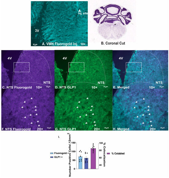GLP1 neurons in the NTS project to the VMN. (A), photomicrograph depicting the Fluorogold injection site in the VMN. (B), representative image depicting location of NTS in coronal cut. The middle panel show the Fluorogold-filled neurons (C,F), the GLP1-positive neurons (D,G) in the NTS, as well as a merger of the two panels (E,H) at 10× and 20×, respectively. The bar graph in (I) depicts the number of Fluorogold-filled and GLP1-positive NTS neurons, as well as the percentage of neurons colocalizing the two markers.