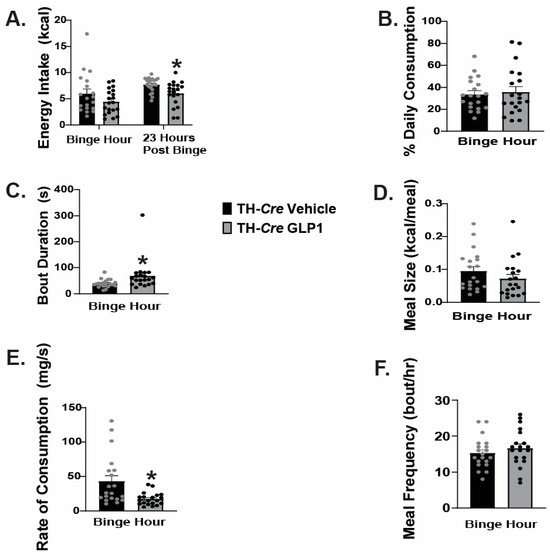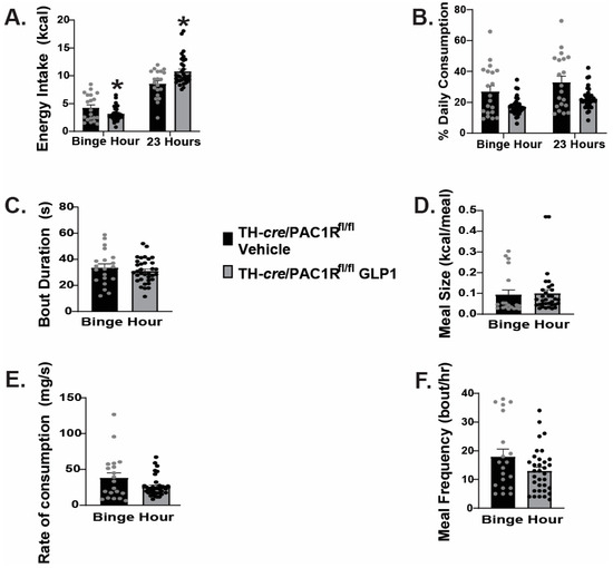 Delivery of GLP1 into the VMN of TH-cre/PAC1Rfl/fl mice modestly reduces hedonic feeding while increasing homeostatic feeding. Intra-VMN administration of GLP1 significantly reduces binge consumption, and significantly increases energy intake during the 23-h post-binge period (A). The GLP1 (30 pmol; 0.2 μL)-induced decrease in binge consumption is associated with a decrease in the percent daily caloric consumption during the binge hour (B) but not bout duration (C), meal size (D), the rate of consumption (E) or meal frequency (F). The increased bout duration and decrease rate of consumption caused by GLP1 in TH-cre mice are no longer apparent in TH-cre/PAC1Rfl/fl animals. * p < 0.05 relative to saline vehicle.