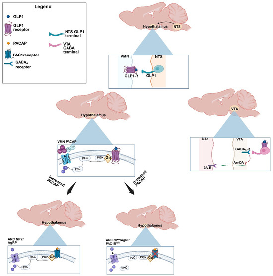 - Sayers, S.; Le, N.; Wagner, E.J. The role of pituitary adenylate cyclase-activating polypeptide neurons in the hypothalamic ventromedial nucleus and the cognate PAC1 receptor in the regulation of hedonic feeding. Front. Nutr. 2024, 11. [Google Scholar] [CrossRef]