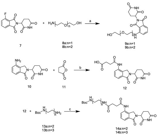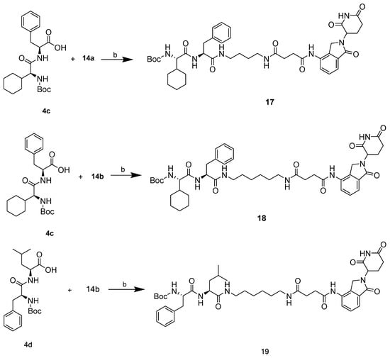 A mixture of 12 (1.08 g, 3 mmol), Monoboc butylenediamine (0.56 g, 3 mmol), and DMAP (0.18, 1.5 mmol) in DMF (15 mL) was stirred. Under ice bath conditions, EDCI (0.86 g, 4.5 mmol) and DIPEA (1.5 mL) were added. After maintaining for 30 min, the ice bath was removed, and the mixture was stirred at room temperature for 10 h. After the reaction was completed, the product 14a was isolated and purified by column chromatography, resulting in 14a 57% yield. 1HNMR (600 MHz, DMSO) δ 11.04 (s, 1H), 9.87 (s, 1H), 7.85 (d, J = 33.3 Hz, 2H), 7.49 (s, 2H), 6.79 (s, 1H), 5.15 (dd, J = 13.3, 5.1 Hz, 1H), 4.35 (dd, J = 42.8, 17.5Hz, 2H), 3.01 (d, J = 5.2 Hz, 2H), 2.88 (d, J = 5.1 Hz, 3H), 2.60 (dd, J = 17.4, 10.5 Hz, 3H),2.40 (t, J = 7.3 Hz, 2H), 2.32 (ddd, J = 26.3, 13.3, 4.3 Hz, 1H), 2.03 (dd, J = 8.9, 3.6 Hz, 1H), 1.35 (d, J = 12.4 Hz, 13H).