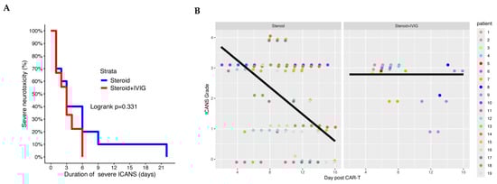 The values for cumulative steroid days were 11.2 (range, 4–26) in the glucocorticoids + IVIG arm and 13.5 (range, 6–33) in the glucocorticoids-only arm. The median cumulative steroid days after initiation of IVIG was 7.77 days (range, 2–21). The median TTR of severe ICANS down to grade ≤ 2 while receiving glucocorticoids was 3 days for both groups (log-rank p = 0.33; Figure 1A).