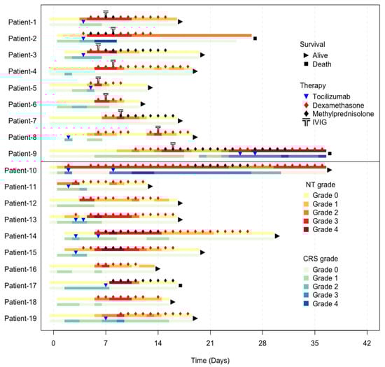 Clinical outcomes and medical interventions after CAR-T therapy in patients over time. Patients 1 through 9 received IVIG + glucocorticoids and patients 10 through 19 received glucocorticoids alone. The top bar represents the ICANS profile, and the lower bar represents the CRS profile. The grading of each type of toxicity is labeled with a different color, as demonstrated in the legend. Each intervention, such as tocilizumab, dexamethasone, methylprednisolone, or IVIG, is labeled with a different symbol, as demonstrated in the legend. Abbreviations: CAR-T, chimeric antigen receptor T-cell; CRS, cytokine release syndrome; ICANS, immune effector cell-associated neurotoxicity syndrome; IVIG, intravenous immunoglobulin; NT, neurotoxicity.