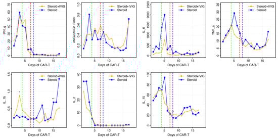 Comparison of median cytokine levels in each group. Serum cytokine data were available for 7 patients who received IVIG + glucocorticoids and 4 patients who received glucocorticoids alone. Dashed lines represent the median day each intervention was given after CAR-T therapy. Green dashed line: tocilizumab (day 4). Red dashed line: glucocorticoids (day 7). Blue dashed line: IVIG (day 8). * trend, but not significantly different (p < 0.1); ** significant difference (p < 0.05). Abbreviations: CAR-T, chimeric antigen receptor T-cell; IVIG, intravenous immunoglobulin.