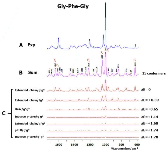 - Pizzanelli, S.; Forte, C.; Monti, S.; Zandomeneghi, G.; Hagarman, A.; Measey, T.J.; Schweitzer-Stenner, R. Conformations of phenylalanine in the tripeptides AFA and GFG probed by combining MD simulations with NMR, FTIR, polarized Raman, and VCD spectroscopy. J. Phys. Chem. B 2010, 114, 3965–3978. [Google Scholar] [CrossRef]