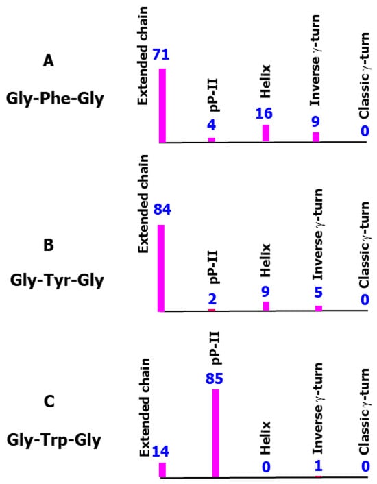 - Schweitzer-Stenner, R.; Hagarman, A.; Toal, S.; Mathieu, D.; Schwalbe, H. Disorder and order in unfolded and disordered peptides and proteins: A view derived from tripeptide conformational analysis. I. Tripeptides with long and predominantly hydrophobic side chains. Proteins 2013, 81, 955–967. [Google Scholar] [CrossRef]