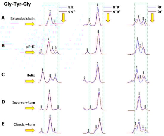 - Schweitzer-Stenner, R. Dihedral angles of tripeptides in solution directly determined by polarized Raman and FTIR spectroscopy. Biophys. J. 2002, 83, 523–532. [Google Scholar] [CrossRef]