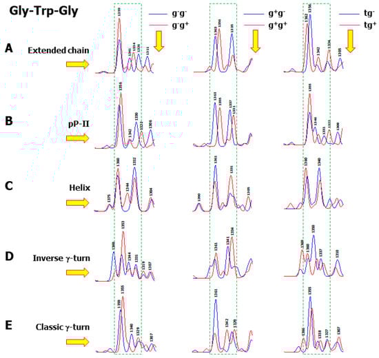 - Hernández, B.; Coïc, Y.M.; Kruglik, S.G.; Sanchez-Cortes, S.; Ghomi, M. Relationships between conformational and vibrational features of tryptophan characteristic Raman markers. Spectrochimica Acta A 2024, 316, 124377. [Google Scholar] [CrossRef]