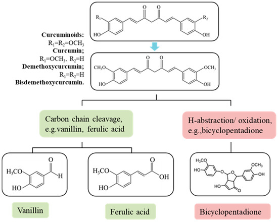Figure 1. Structure and degradation of curcumin at physiological pH values in aqueous solutions [43,44].