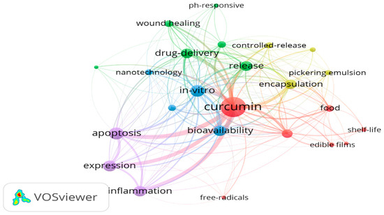 The development trend of curcumin in recent years is described in Figure 3. Here, the central node, “curcumin”, is connected to a wide range of keywords, indicating its multifaceted applications in various fields, including drug delivery, food science, and medical research. The density of connections suggests that curcumin is a highly versatile compound with significant interest across multiple disciplines. Keywords such as “drug-delivery”, “nanotechnology”, “controlled-release”, and “in-vitro” form a prominent cluster. This highlights the growing interest in curcumin as a therapeutic agent, particularly in the context of nanotechnology-based drug delivery systems. Research in this area focuses on enhancing curcumin’s bioavailability, stability, and targeted release. Future trends may include the development of advanced nano-carriers, such as liposomes and nanoparticles, to optimize curcumin’s therapeutic potential. The cluster around “food”, “shelf-life”, and “edible films” reflects curcumin’s role in food preservation and functional food development. Studies are exploring curcumin’s antimicrobial and antioxidant properties to extend shelf life and improve food safety. Keywords like “apoptosis”, “inflammation”, “free radicals”, and “wound healing” indicate curcumin’s potential in medical applications. Research in this area emphasizes curcumin’s anti-inflammatory, antioxidant, and anticancer properties. The connection between “encapsulation”, “Pickering emulsion”, and “release” suggests advancements in curcumin encapsulation technologies. These technologies aim to enhance curcumin’s stability and controlled release, which are critical for its application in both food and pharmaceutical industries. In conclusion, the keyword map provides a comprehensive overview of curcumin’s research landscape, highlighting both current trends and future opportunities. By addressing these areas, researchers can further advance curcumin’s applications across multiple fields.