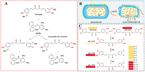 Figure 5. Chemical reaction between DPPH and curcumin (A) [63], antibacterial action of curcumin in film: schematic diagram of mechanism (B) [24], chemical structure changes of curcumin molecule in the different pH conditions (C) [67,68].