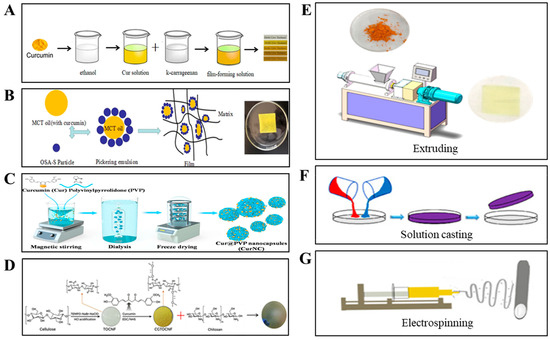 Figure 6. Curcumin-loading methods during the preparation of film: loading through adding directly (A) [67], loading through emulsification (B) [80], loading through curcumin nanoencapsulation (C) [55], loading through grafting (D) [89]. The preparation methods of extruding (E) [82], solution casting (F) [90], and electrospinning (G) [88].