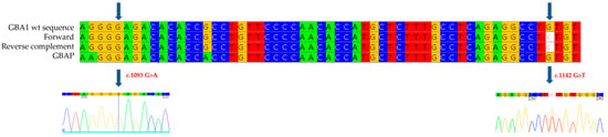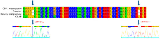 The alignment of forward and reverse respect to GBA1 and GBAP sequences shows the c.1093 G>A and c.1142 G>T mutations to be heterozygous in the proband of case 1. Each nucleotide corresponds to a different color: red for Thymine, blue for Cytosine, yellow for Guanine, green for Adenine. Arrows indicate the mutation. The number present in the electropherograms refers to the position of the nucleotide with respect to the first nucleotide of the amplified sequence.