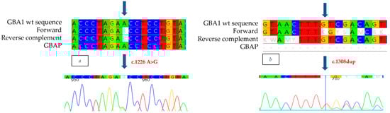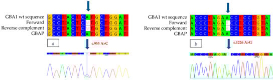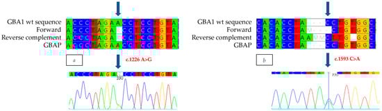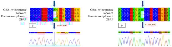 The alignment of forward and reverse respect to GBA1 and GBAP sequences shows the c.857 A>G mutation to be heterozygous in the proband of case 3 (a) and the c.1226 A>G mutation to be heterozygous in the proband of case 3 (b). Each nucleotide corresponds to a different color: red for Thymine, blue for Cytosine, yellow for Guanine, green for Adenine. Arrows indicate the mutation. The number present in the electropherograms refers to the position of the nucleotide with respect to the first nucleotide of the amplified sequence.