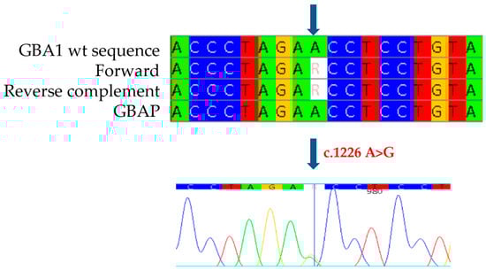 The alignment of forward and reverse respect to GBA1 and GBAP sequences shows only the c.1226 A>G mutation to be heterozygous in the mother. Each nucleotide corresponds to a different color: red for Thymine, blue for Cytosine, yellow for Guanine, green for Adenine. Arrows indicate the mutation. The number present in the electropherogram refers to the position of the nucleotide with respect to the first nucleotide of the amplified sequence.