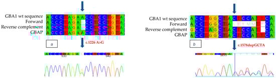The alignment of forward and reverse respect to GBA1 and GBAP sequences shows the c.1226 A>G mutation to be heterozygous in the proband of case 4 (a) and the c.1578_1581dup mutation to be heterozygous in the proband of case 4 (b). Each nucleotide corresponds to a different color: red for Thymine, blue for Cytosine, yellow for Guanine, green for Adenine. Arrows indicate the mutation. The number present in the electropherograms refers to the position of the nucleotide with respect to the first nucleotide of the amplified sequence.