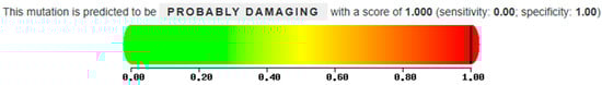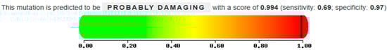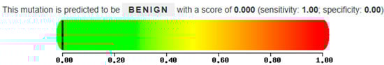 The proband in case 1 has two heterozygous compound mutations: the known E326K mutation, the significance of which is widely debated but which does not appear to be related to a severe disease phenotype [21], and the new C342F mutation. The latter results from the replacement of cysteine, a polar and hydrophobic amino acid, at position 342 with a phenylalanine, an apolar amino acid, resulting from the removal of the signal peptide. According to an analysis carried out using Polyphen 2 (http://genetics.bwh.harvard.edu/pph2/, accessed on 9 February 2025), a tool for predicting the potential effect of an amino acid substitution on the structure and function of a human protein, we can affirm that the mutation could have a malign effect, with a score of 1 (in a range from 0, indicating benignity, to 1, indicating pathogenicity) (Figure 9).