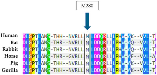 The proband in case 2 has two mutations in a heterozygous compound, the known N370S mutation believed to cause Gaucher disease and the new M280L mutation. This is caused by the replacement of a Methionine, an apolar amino acid, with a Leucine, also an apolar amino acid, at position 280 of the protein following the removal of the signal peptide. In this case, the analysis conducted using Polyphen 2 suggests that the mutation is not directly related to the disease and is therefore potentially benign, as indicated by a score of 0.00 (Figure 11). However, the strong evolutionary conservation of the amino acid M280 (Figure 12) and the absence of glucocerebrosidase activity in both the test subject and the father, both with heterozygous compound for the M280L/N370S mutations, indicate that the M280L mutation could be considered causative of Gaucher disease in heterozygous compound with a second mutation.