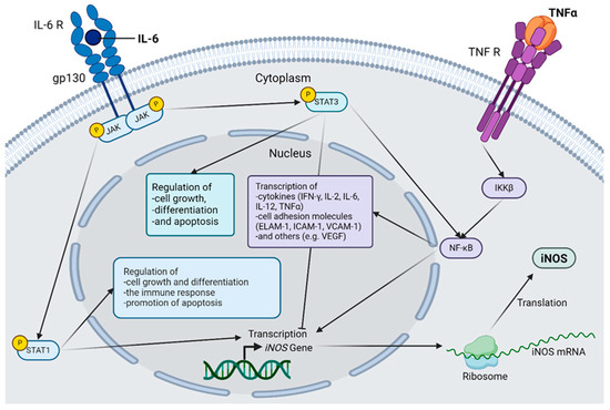 Selected inflammatory cascades in diabetic retinopathy. The connection between interleukin(IL)-6, tumor necrosis factor α (TNF-α) and inducible nictric oxide synthetase (iNOS) is shown. IL-6 activates Janus kinases (JAK), which in turn activate both signal transducer and activator of transcription (STAT) 1 and STAT3 via the IL-6 receptor, forming a hexamer together with glycoprotein 130 (gp130). STAT1 acts as a transcription factor for iNOS and regulates cell growth and differentiation, as well as the immune response. STAT1 also has a proapoptotic effect. STAT3 also regulates cell growth, differentiation, and apoptosis but can have both pro- and anti-apoptotic effects. STAT3 directly activates the nuclear factor kappa-light-chain-enhancer of activated B cells (NF-κB) and simultaneously inhibits iNOS transcription. TNF-α binds to its corresponding receptor, and the inhibitor of nuclear factor kappa-B kinase subunit beta (IKKβ) is activated via several intermediate steps that are necessary for the activation of the transcription factor NF-κB. The genes induced by NF-κB are mainly inflammatory mediators, including iNOS; cytokines, such as Interferon-gamma (IFN-γ), IL-2, IL-6, IL-12, and TNF-α; various cell adhesion molecules, such as endothelial-leukocyte adhesion molecule 1 (ELAM-1), Intercellular Adhesion Molecule 1 (ICAM-1), and vascular cell adhesion protein 1 (VCAM-1); and other factors, such as vascular endothelial growth factor (VEGF). After the induction of iNOS gene transcription, the mRNA is translated to the ribosome, and the protein is produced, which plays an important role in the pathogenesis of diabetic retinopathy. Abbreviations: gp130, glycoprotein 130; IKKβ, inhibitor of the enhancer of the kappa light polypeptide gene in B cells beta; IL, interleukin; iNOS, inducible nitric oxide synthetase; JAK, Janus kinase; mRNA, messenger RNA; NF-κB, nuclear factor kappa light chain enhancer of activated B cells; R, receptor; STAT, Signal Transducers and Activators of Transcription; TNF, tumor necrosis factor. The figure was created by using https://www.biorender.com/ accessed 12 December 2024.