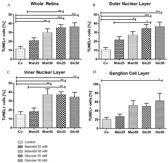 A significant increase in apoptosis was observed between the control group (Co) (12%) and 25 mM D-Glucose group (Glc25) group (36%) (p < 0.001) and between the 25 mM D-Mannitol group (Man25) (21%) and Glc25 groups (p < 0.01) for the whole retina. A comparison of the control with the 50 mM D-Mannitol group (Man50) (30%) and the 50 mM D-Glucose group (Glc50) (37%) showed a significant increase in cell death (both p < 0.01 and p < 0.001), but no significant difference was observed between Man50 and Glc50 (Figure 3A). In the outer nuclear layer (ONL), 11% of TUNEL+ cells in the control group were statistically significant compared to 35% of TUNEL+ cells in the Glc25 group (p < 0.001). There was a significantly lower apoptosis rate in the Man25 group (22% TUNEL+ cells) compared to that in the Glc25 group (p < 0.05). The Man50 (27%) and Glc50 (37%) groups had more apoptotic cells than the control group (p < 0.05, p < 0.001), but there was no significant difference between them (Figure 3B). Similarly, in the inner nuclear layer (INL), Glc25 (37%) showed significantly more labeled cells than the control (15%) (p < 0.01) and Man25 (19%) (p < 0.01), and Man50 (38%) and Glc50 (35%) were different from the control (both p < 0.01) (Figure 3C). Within the individual cell layers, the highest percentage of cell death was recorded in the ganglion cell layer (GCL): the control group had the lowest value (21%), followed by Man25 (27%), Glc25 (50%), Man50 (52%), and Glc50 (63%), with only a significant difference between Glc50 and the control group (p < 0.05) (Figure 3D).