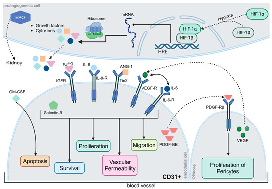 Regulation of Angiogenesis. Typically, neoangiogenesis is triggered by hypoxia, whereby hypoxia-inducible factor (HIF)-1α and HIF-1β form a complex that induces the expression of hypoxia-responsive transcription factors. The relevant gene segments were transcribed, translated, and released from the cells. Some proteins, such as erythropoietin (EPO), are transported via the bloodstream to the kidneys. Others act locally on surrounding blood vessels. Insulin-like growth factor-2, interleukin-6 and -8, angiopoietin-1, VEGF, and galectin-9 jointly affect cell survival, endothelial cell proliferation, vascular permeability, and migration via different metabolic pathways. In contrast, granulocyte-macrophage colony-stimulating factor (GM-CSF) exerts a pro-apoptotic effect on CD31+ endothelial cells. Platelet-derived growth factor (PDGF-BB) has a proliferative effect on pericytes, which are extremely important for physiological neoangiogenesis. However, the precise regulation of angiogenesis is still poorly understood, although the interactions between different metabolic pathways have been studied in detail. Abbreviations: ANG-1, angiopoietin-1; CD31, cluster of differentiation 31; EPO, erythropoietin; GM-CSF, granulocyte-macrophage colony-stimulating factor; HIF, hypoxia-inducible factor; HRE, hypoxia response elements; IGF, Insulin-like growth factor; IL, interleukin; mRNA, messenger ribonucleic acid; PDGF-BB, platelet-derived growth factor; R, receptor; Tie2, TEK receptor tyrosine kinase; VEGF, vascular endothelial growth factor. The figure was created by using https://www.biorender.com/ accessed 12 December 2024.