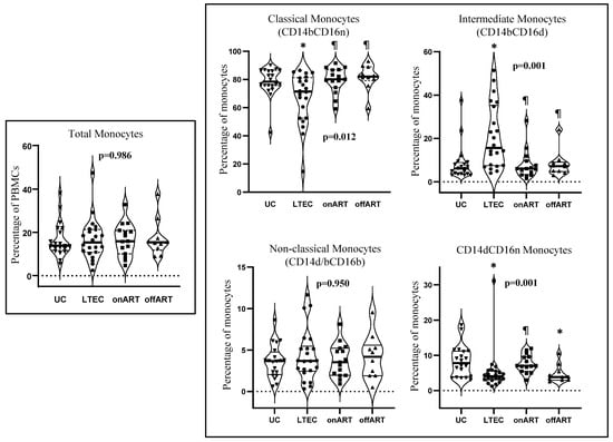 Violin-plot graphs showing the levels of monocytes (left graph) and of different subsets of monocytes based on the relative expressions of CD14 and CD16 markers (right graphs) in the different study groups. The Y-axis on the graphs represents the level expressed either as the percentage of peripheral blood mononuclear cells (for the left graph showing the total monocytes) or as the percentage of the total monocytes (for the right graphs showing the different subsets of monocytes). The p-values inside the graphs are for the comparison among the four study groups (Kruskal–Wallis test); (*) p < 0.05 compared to uninfected controls (the UC group); (¶) p < 0.05 compared to the LTEC group (Mann–Whitney U test). CD14 and CD16 expressions were categorized into three levels: negative (n), dim (d), and bright (b).