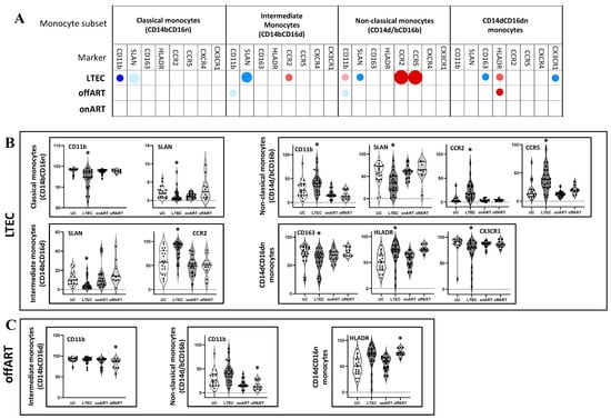 Figure 2. (A) Schematic representation (bubble diagram) of the profile of the alterations in single-marker expressions by different subsets of monocytes in the PLWH groups compared to the UC group as a reference. Each dot in the table represents a significant difference with respect to the UC reference group. The size of the dot indicates the degree of the difference in the fold change: <2, 2–3, and >3 from the smallest to the biggest dots. Red colors indicate increases, and blue colors indicate decreases with respect to the UC group. The level of statistical significance (corrected p-value) is indicated by the color tone: 0.05–0.01, 0.01–0.001, and <0.001 for the light, medium, and dark tones, respectively. (B) Violin plots of the expression levels of each single marker by different monocyte subsets in the LTEC study groups: (*) p < 0.05 with respect to the UC group. Only those single markers and monocyte subsets that showed a significant difference between the LTEC and UC groups are shown. (C) Violin plots of the expression levels of each single marker by different monocyte subsets in the offART study groups: (*) p < 0.05 with respect to the UC group. Only those single markers and monocyte subsets that showed a significant difference between the offART and UC groups are displayed. - Intermediate monocytes: Decreased SLAN and increased CCR2 expressions;