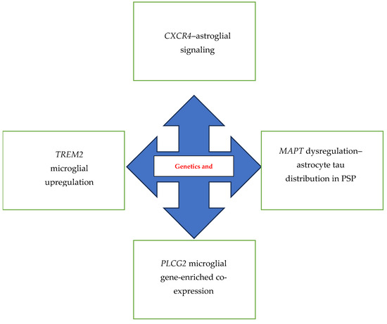 PSP is characterized by pronounced clinical deterioration; inefficient diagnosis through in vivo diagnostic tools such as magnetic resonance imaging (MRI), positron emission tomography (PET), and single-photon emission computed tomography (SPECT); and a lack of evidence-based treatments. Indeed, in vivo examination only enables a possible or probable diagnosis, with a definite diagnosis dependent on neuropathological evaluation [2]. PSP is generally considered a sporadic disease, although research into a link between familial genetics and increased risk of the disease is evolving alongside investigations into genetic aspects of PSP and inflammation-induced neurodegeneration. Despite multiple studies on the pathogenesis of PSP indicating a possible impact of glial activation, it is unclear whether inflammation is the cause or consequence of neurodegenerative mechanisms [5,6]. In PSP, the issue of autoimmune mechanisms was brought up based on HLA phenotyping in neuropathologically verified PSP cases [7]. Wang et al., in a preliminary study, showed that epitopes within the tau peptide may have affinity to HLA alleles, which could be detected in a subset of PSP patients. Anti-IGLON5, a disease that clinically partially overlaps with PSP, is associated with the presence of HLA-DRB1*10:01 and HLA-DQB1*05:01 alleles [8]. Certain features of microglial activation and cytokines derived therefrom may be linked with a potentially beneficial impact on clinical impairments, contrary to their role in atrophic changes [5,6,9,10]. Additionally, different clinical subtypes are associated with diverse interleukin and inflammatory factor profiles that, considering the impact of tau loading and its distribution, may be determined by genetics [11,12,13,14]. Therefore, the current review provides a perspective on the features linking the genetic and inflammatory aspects of PSP.