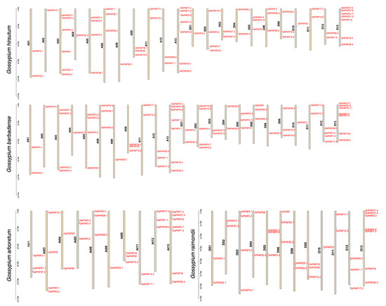 Chromosomal locations of PAPs in four cotton species with gene IDs shown on the right side. The vertical bar on the left side represents the position of the gene and length of chromosome.