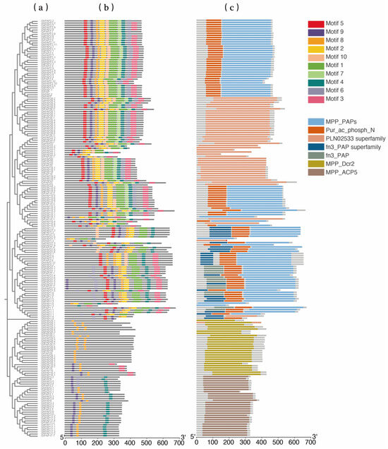 Phylogenetic relationship, conserved domain, and motif element maps of PAP genes identified in four cotton varieties. (a) Phylogenetic tree based on these PAP genes; (b) ten conserved motifs identified in four cotton varieties; (c) conserved domains identified in four cotton varieties.