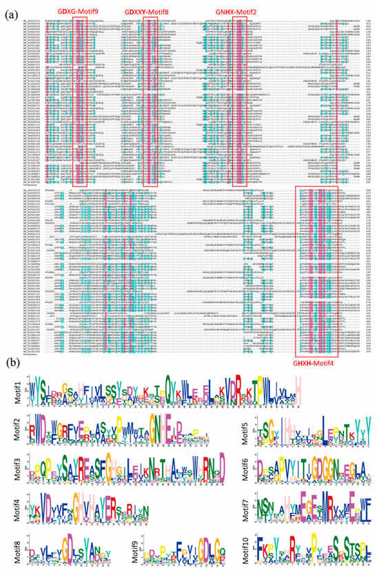 To further investigate the features of conserved domains, we obtained the conserved sequences of the 193 identified PAP proteins by performing multiple sequence alignment of them in DNAMAN (Figure S1). To illustrate these sequences more clearly, we used the sequence of GhPAPs as a representative, which shares the same features with all PAP proteins in the four cotton varieties (Figure S1). Previous studies have confirmed that PAP proteins share five common conserved structural domains/basic motifs in mammals and plants (DxG/GDXXY/GNH(D/E)/VXXH/GHXH) [6], which are consistent with motifs 9, 8, 2, and 4 in our study (Figure 4a). Contrary to our expectations, the motif sequences we identified do not show any obvious “VXXH” structural features (Figure 4b), and the results of multiple sequence alignment also showed that the extent of sequence variations among cotton PAP proteins is higher than we thought. These variations can be explained by the redundancy of PAP genes due to polyploidization of cotton chromosomes, which reduces the selection pressure on PAP genes.