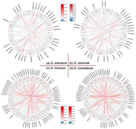 Duplicated cotton PAP genes based on the collinearity of all chromosomes in (a) G. arboreum, (b) G. raimondii, (c) G. hirsutum, and (d) G. barbadense. Each rectangle on the outside of the circle represents a chromosome, and the scale is in megabases. The inner rectangles are heat maps of gene density on the chromosomes. The dense gray lines in the background indicate collinear blocks, while the syntenic PAP gene pairs are highlighted with red lines.
