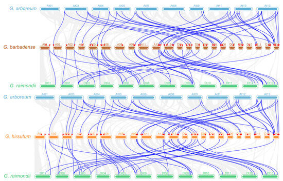 Multiple collinearity analysis of GhPAP and GbPAP genes compared with their ancestor species through multiple synteny plots. The dense gray lines in the background indicate collinear blocks, while the syntenic PAP gene pairs are highlighted with blue lines. The red triangle represents the identified PAP genes.