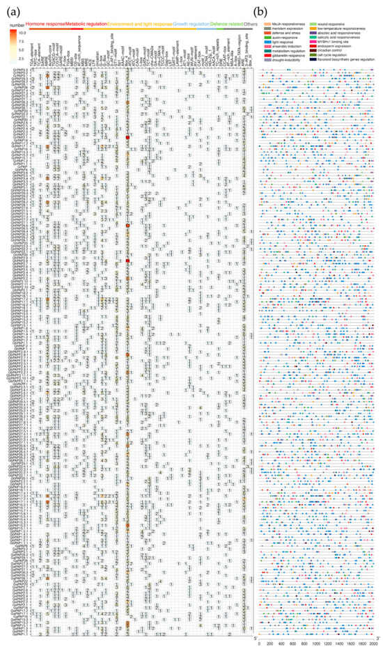 Cis-acting regulatory elements (CREs) are crucial components in the regulation of plant gene expression. Primarily located in the promoter regions of genes, they play a pivotal role in plant growth, development, and environmental adaptation by interacting with transcription factors to precisely regulate gene expression [33,34]. Changes in cis-regulatory elements can drive evolutionary adaptations by altering the gene expression level, timing, and location [35]. To further understand the potential biological functions of cotton PAP proteins, we obtained the sequence 2000 bps upstream of the PAP genes as the promoter sequence and uploaded it to the PlantCARE online database [36] for CRE prediction. These PAP genes are predicted to have a total of 61 homeopathic action elements and possess 40 unique biological functions (Table S3), mainly including hormone response, growth and metabolism regulation, environmental and light response, and defense-related functions (Figure 7a). Among them, CREs involved in “environmental and light response” and “hormone response” appeared with high frequency, occupying 55% and 25% of the total number of CREs, respectively.